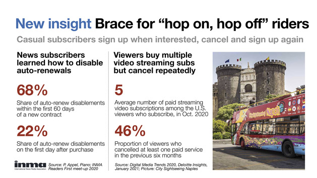 Innovate with cancellation policies, e.g., prepare for Hop On Hop Off subscribers who come back when big news breaks and then cancel quickly