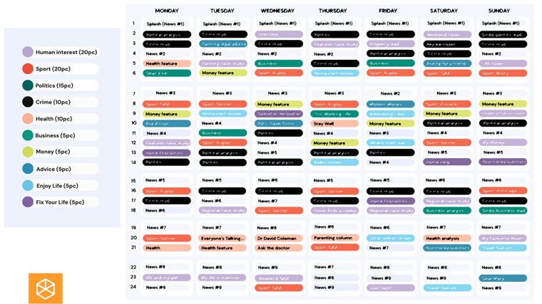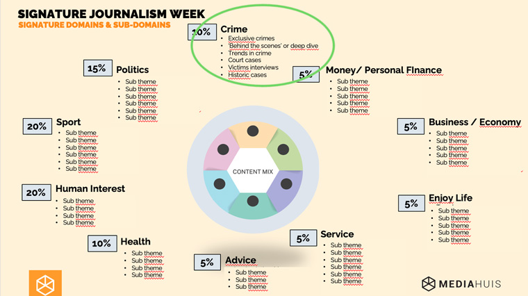 Once the Irish Independent identified its signature journalism — culture did not enter the top domain list — they set out to determine how many stories by topic to plan for in a day and a week. For instance, 15% of the signature journalism slots may be reserved for political coverage and 20% should be human interest.