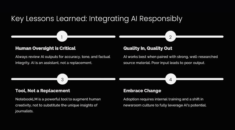 Management addressed these concerns by framing Notebook LM as a complement to, rather than a substitute for, human creativity. Training sessions were introduced to help staff use AI responsibly, focusing on accuracy, tone, and editorial judgment.