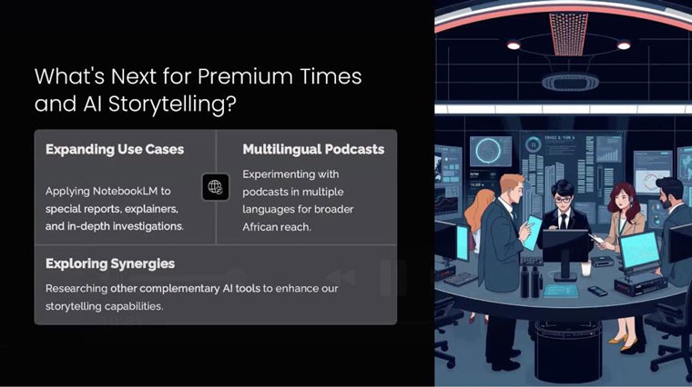 Looking ahead, Premium Times is exploring new ways to apply Notebook LM and other AI tools. Plans include using AI for special report explainers, in-depth investigations, and multilingual podcasts to reach broader audiences across Africa.