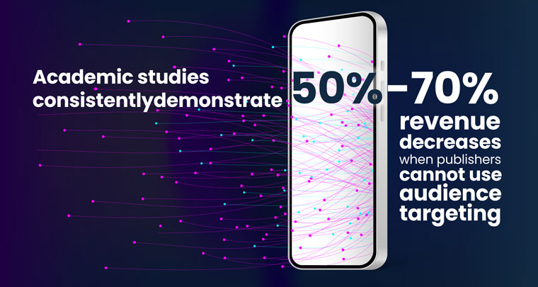 - The revenue penalty is documented and severe: Academic studies consistently demonstrate 50%-70% revenue decreases when publishers cannot use audience targeting. Google’s own research shows 52% publisher revenue decline without cookie-based targeting, while the UK Competition Authority found 70% revenue loss in cookieless environments.